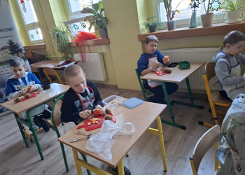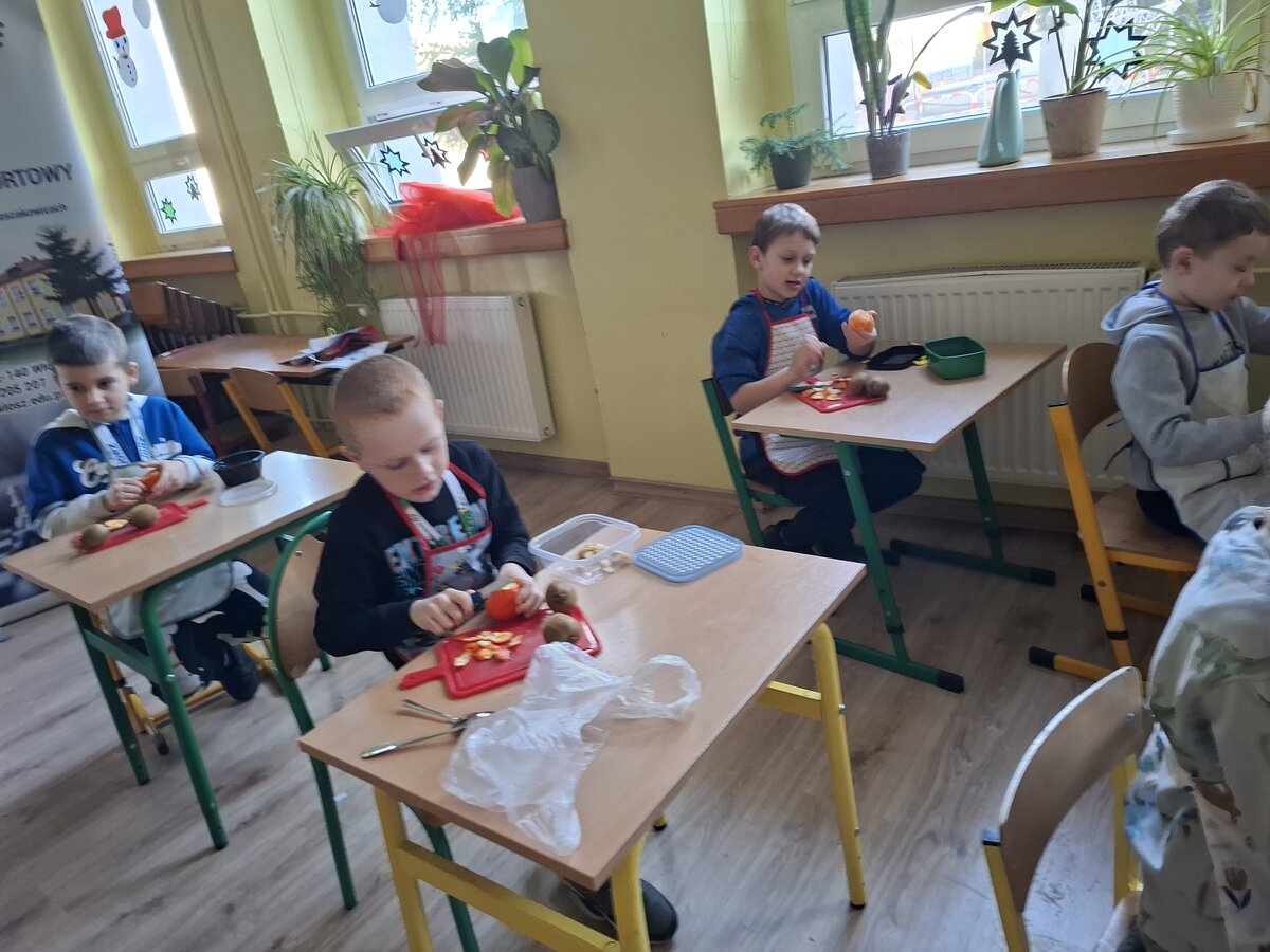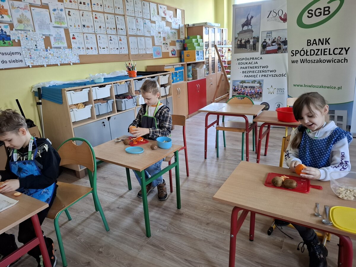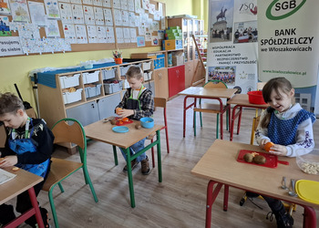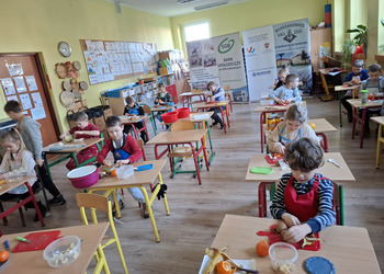W ramach innowacji pedagogicznej „Natalka i Antek w Krainie Wielkiej Matematyki” dzieci z klasy 1 b szukały matematyki w kuchni przygotowując sałatkę owocową.