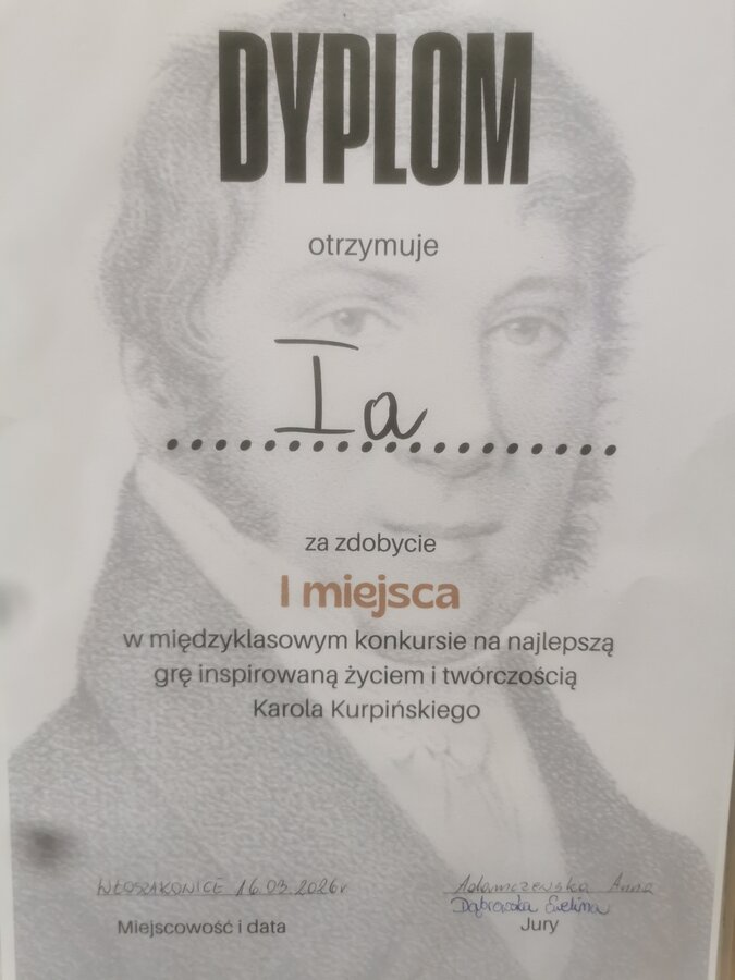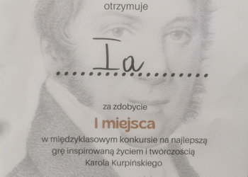 Klasa 1a zwyciężyła na poziomie klas pierwszych w konkursie na grę planszową o życiu i twórczości Karola Kurpińskiego, zorganizowanym z okazji święta patrona szkoły.